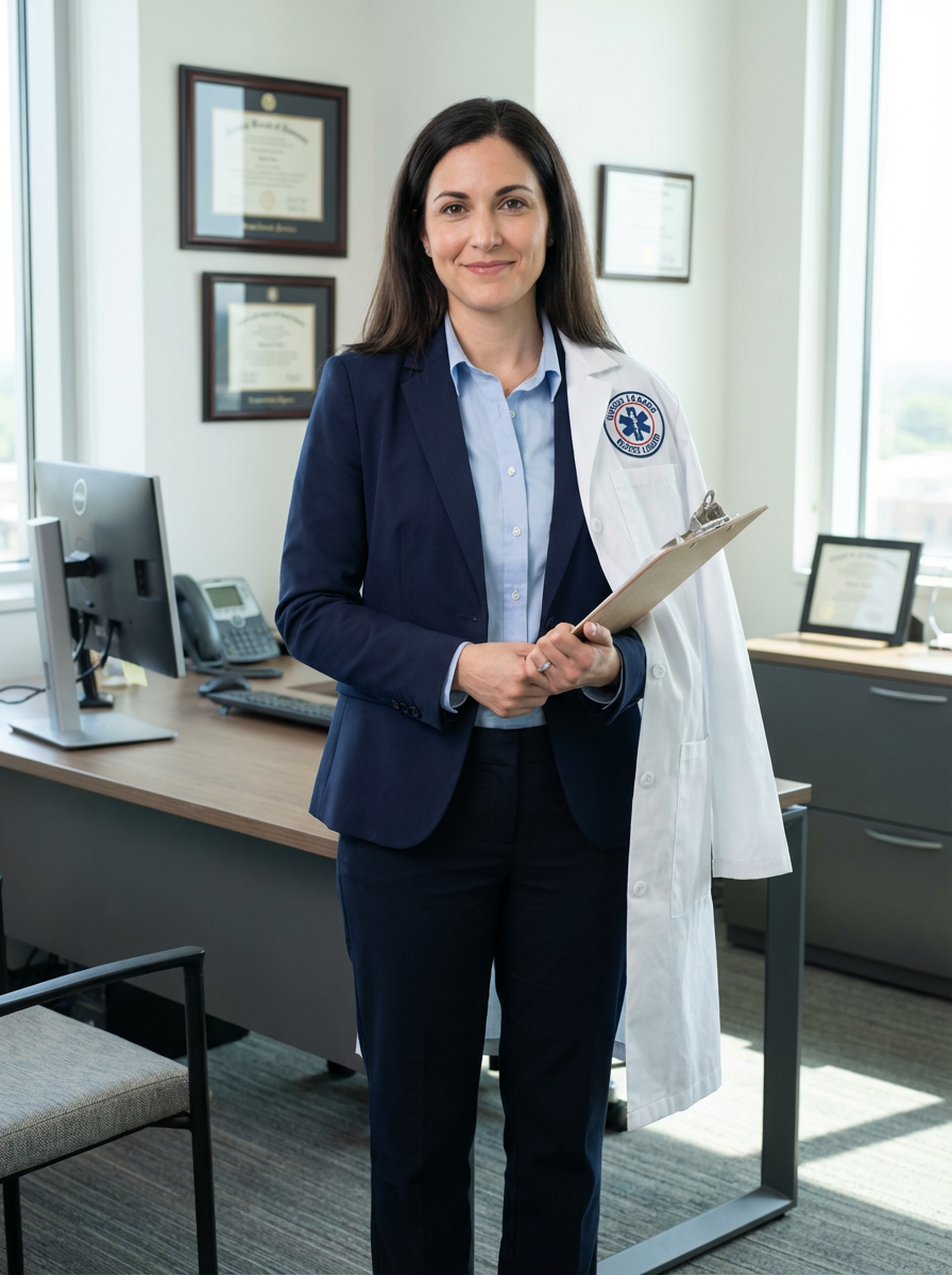 model as nurse leader, business casual with lab coat, authoritative yet approachable, office setting