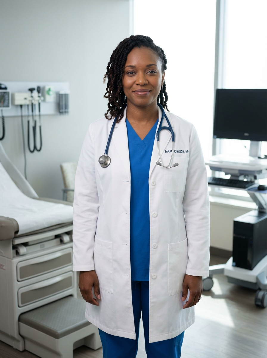 model as nurse practitioner, white coat, professional demeanor, modern medical office, competent caring look