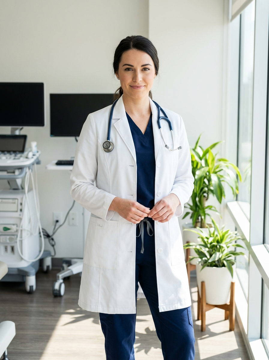 model as nurse practitioner, white coat, professional demeanor, modern medical office, competent caring look