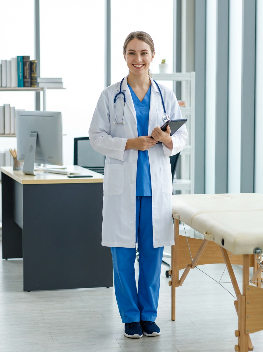 model as nurse practitioner, white coat, professional demeanor, modern medical office, competent caring look