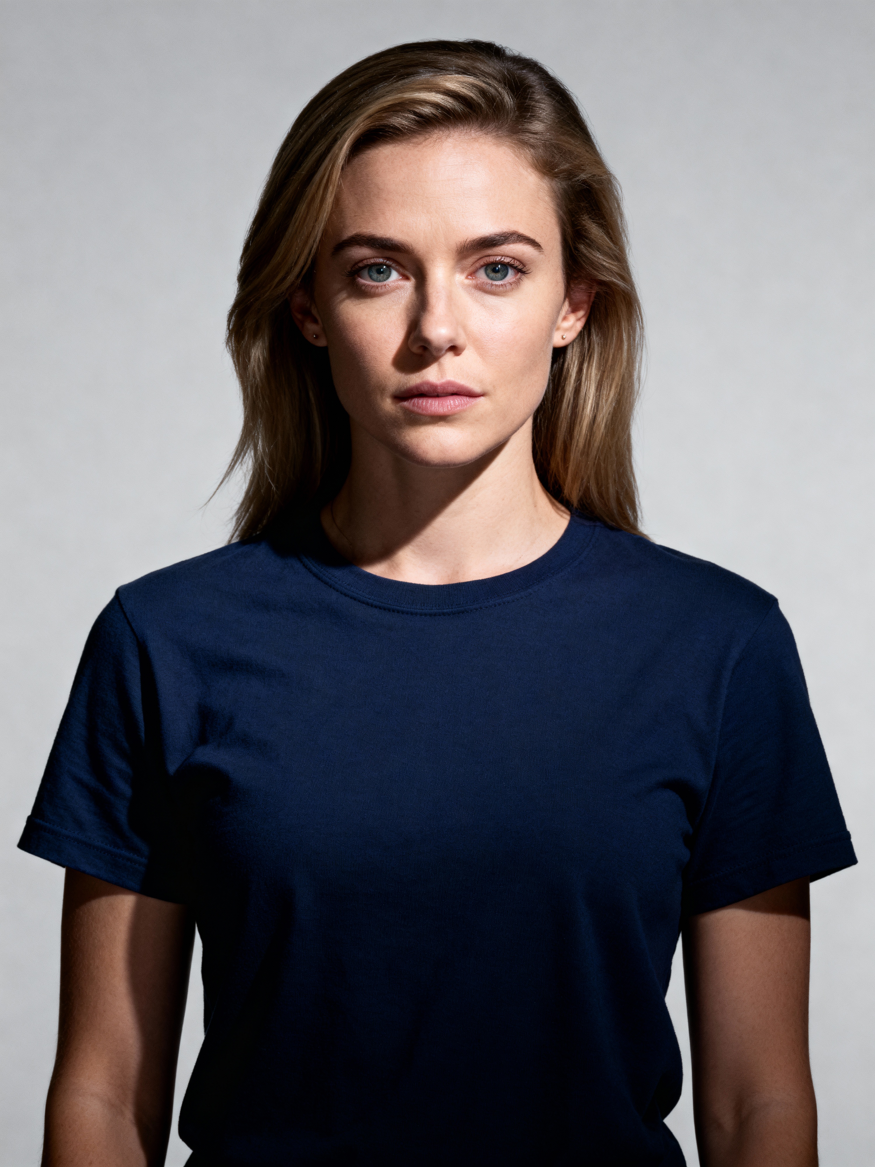 model as official passport photo for government documents. wearing a dark blue navy t-shirt. photorealistic. light gray background. entire face visible. entire head visible