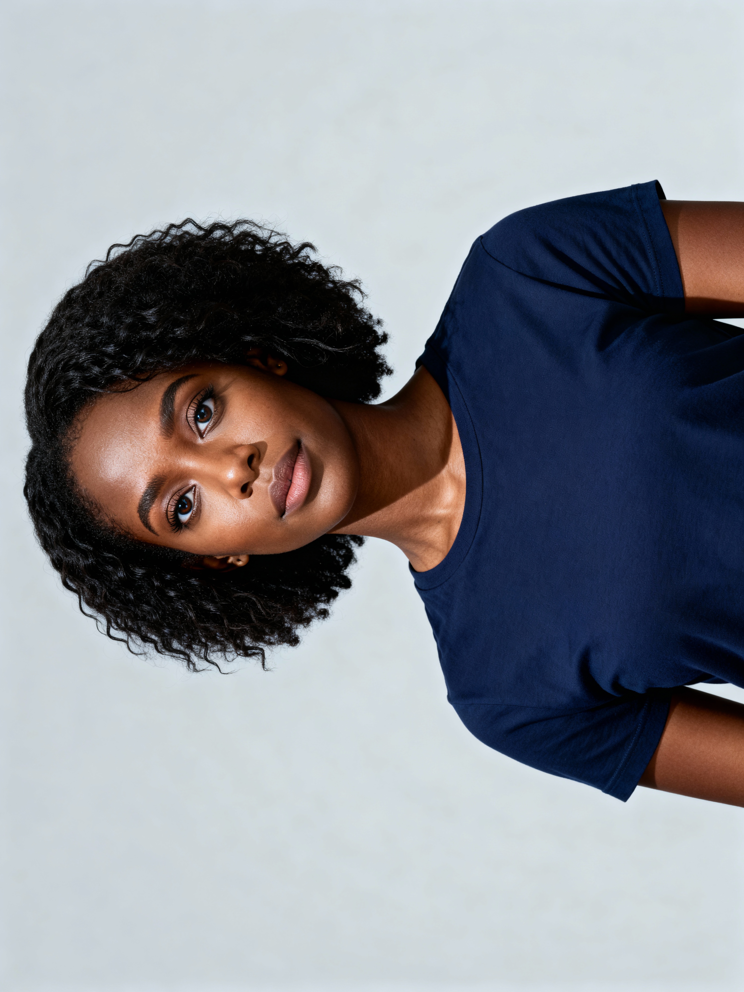 model as official passport photo for government documents. wearing a dark blue navy t-shirt. photorealistic. light gray background. entire face visible. entire head visible