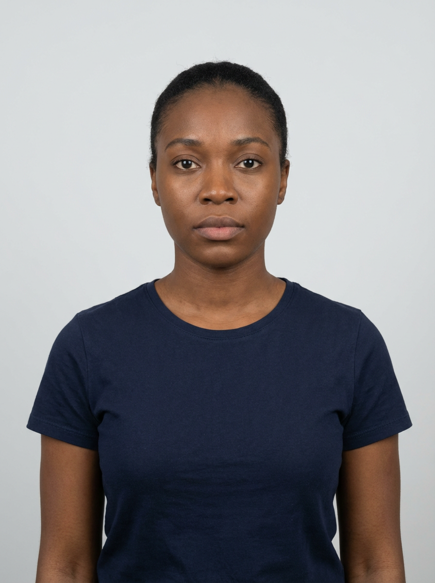 model as official passport photo for government documents. wearing a dark blue navy t-shirt. photorealistic. light gray background. entire face visible. entire head visible