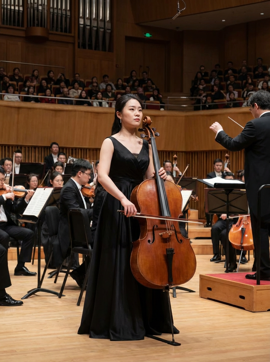 model as orchestra musician, formal black attire, refined classical presence, symphony hall setting