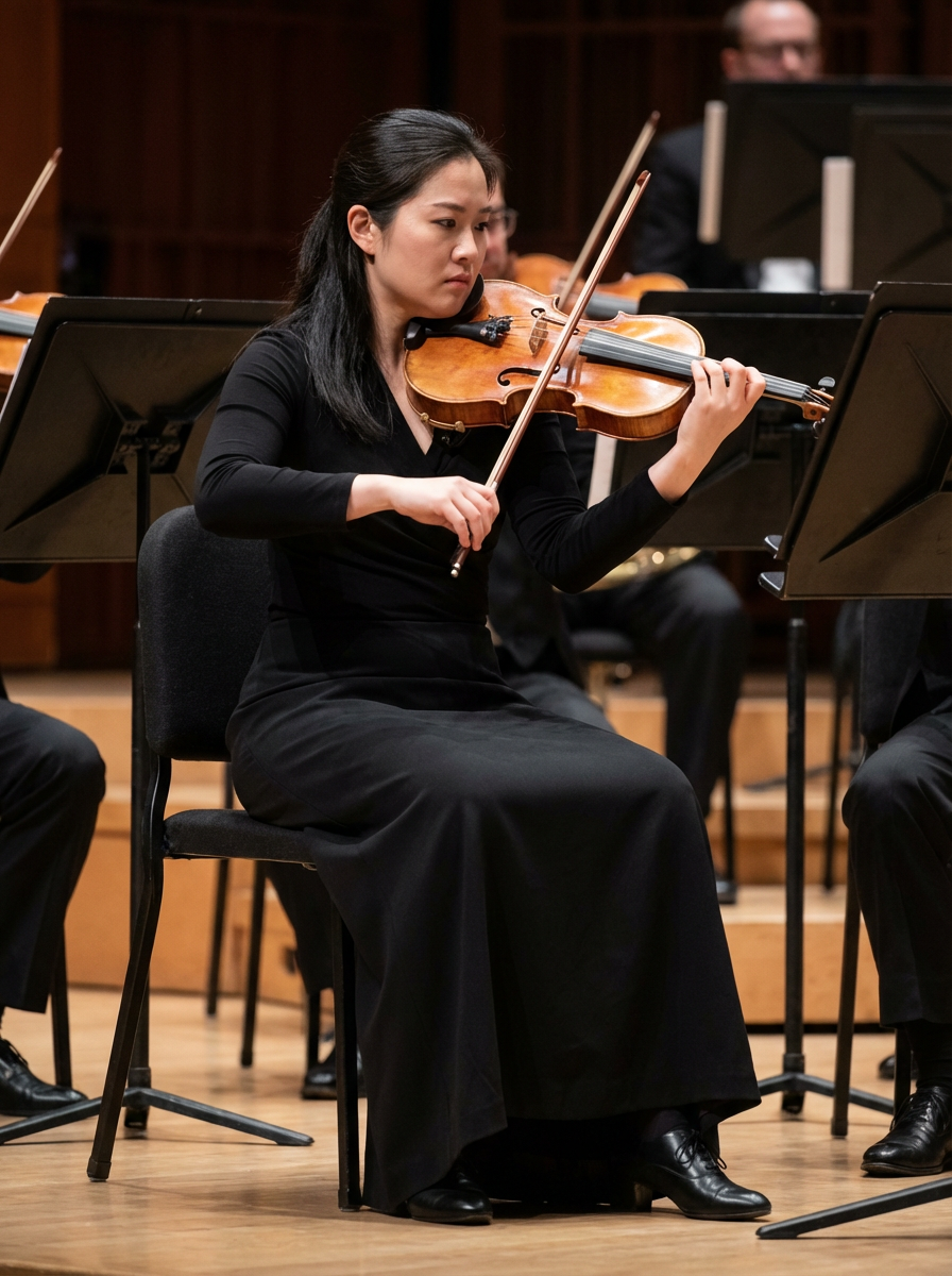 model as orchestra musician, formal black attire, refined classical presence, symphony hall setting