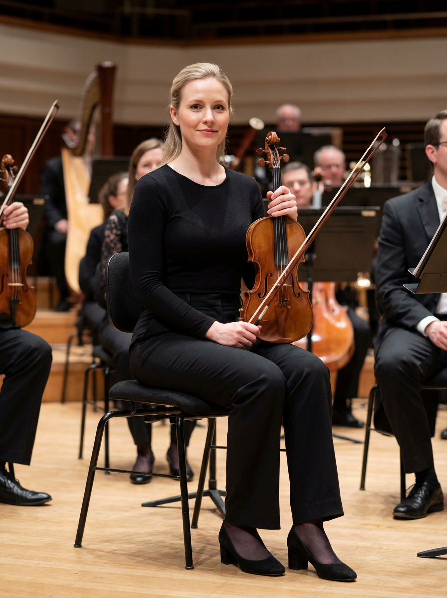 model as orchestra musician, formal black attire, refined classical presence, symphony hall setting