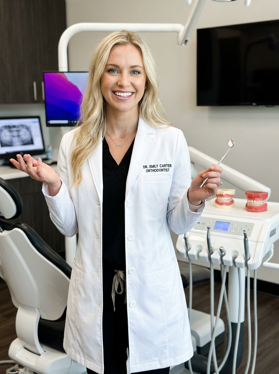 model as orthodontist, professional white coat, friendly approachable smile, modern orthodontic office