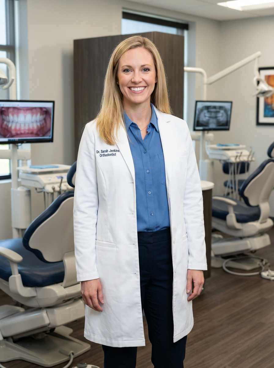 model as orthodontist, professional white coat, friendly approachable smile, modern orthodontic office