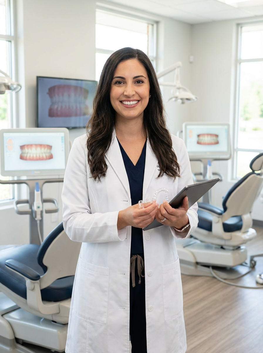 model as orthodontist, professional white coat, friendly approachable smile, modern orthodontic office