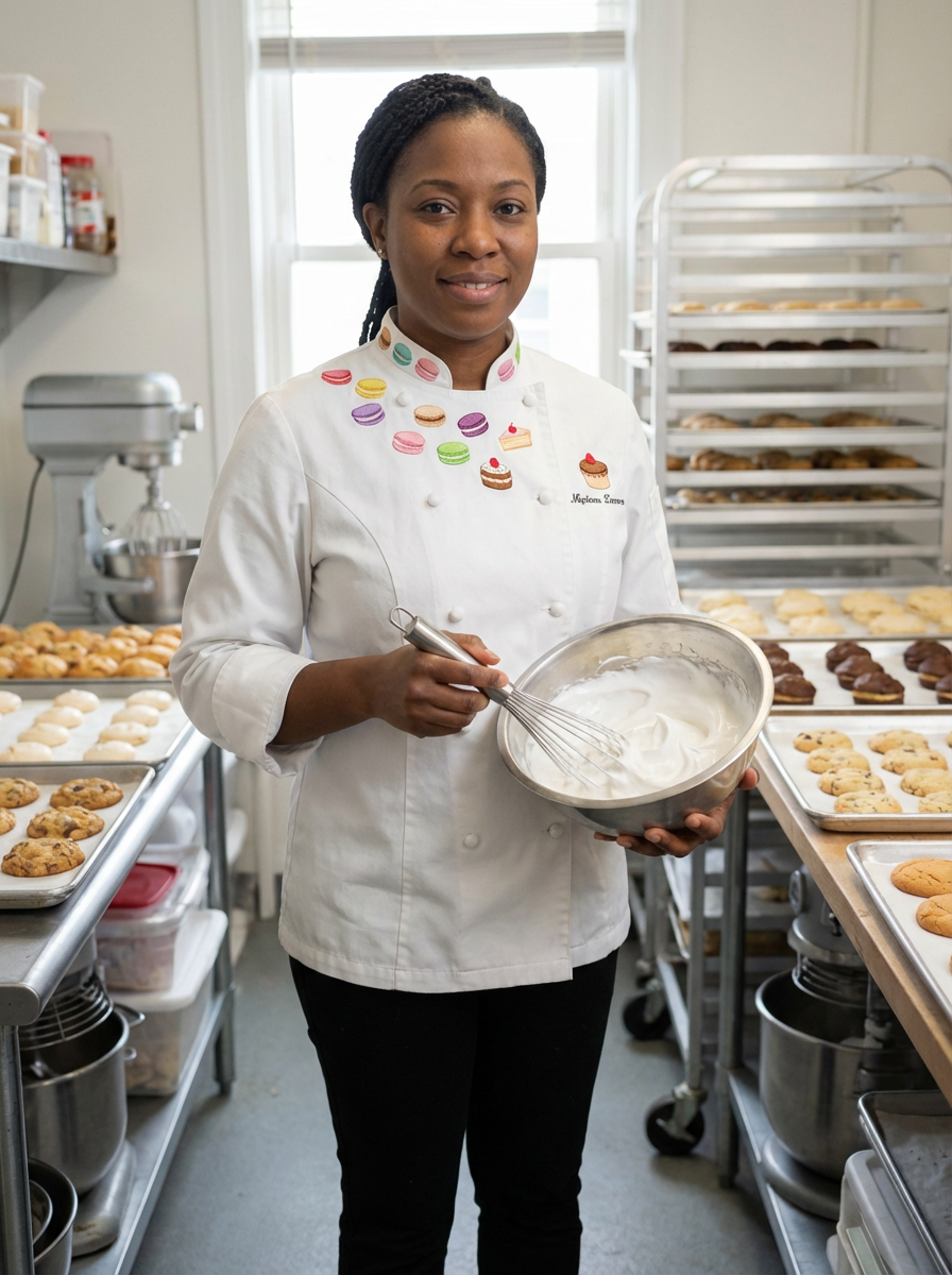 model as pastry chef, white coat with pastry decorations visible, creative artistic expression, bakery kitchen