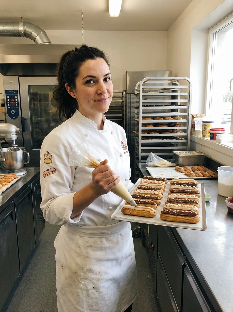 model as pastry chef, white coat with pastry decorations visible, creative artistic expression, bakery kitchen