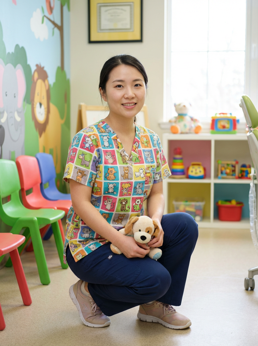 model as pediatric dentist, colorful friendly scrubs, gentle reassuring expression, child-friendly office decor