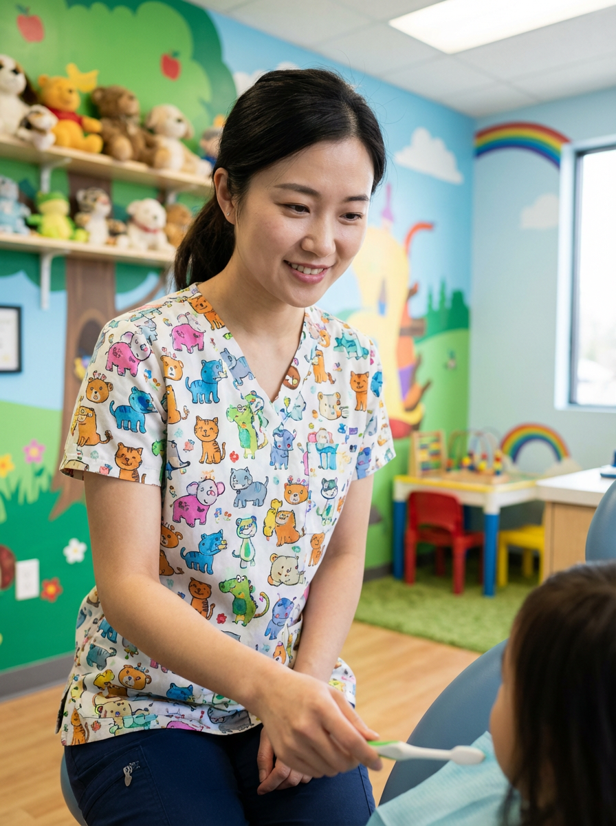 model as pediatric dentist, colorful friendly scrubs, gentle reassuring expression, child-friendly office decor