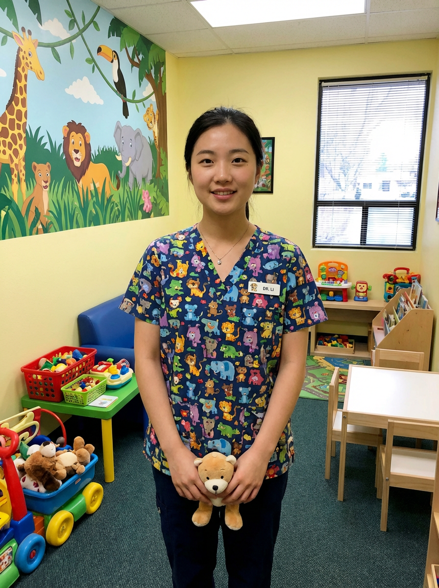 model as pediatric dentist, colorful friendly scrubs, gentle reassuring expression, child-friendly office decor