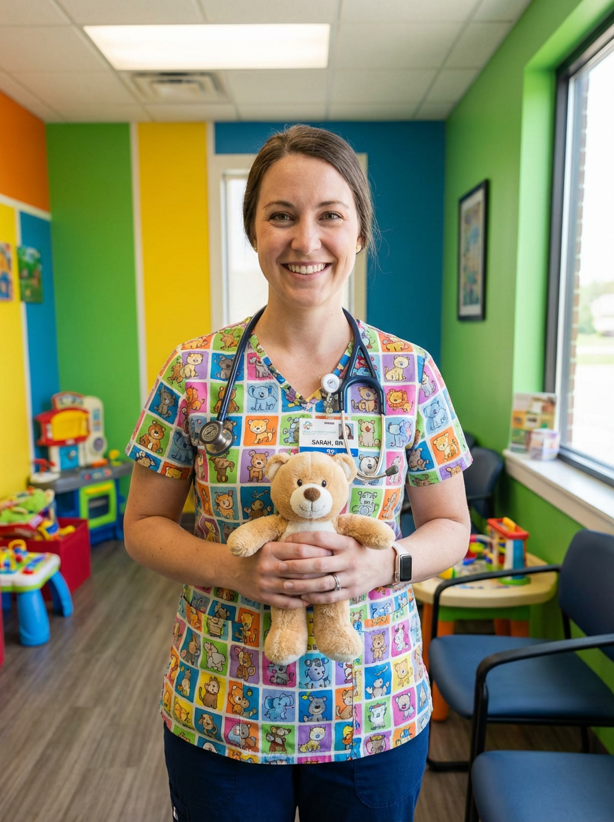 model as pediatric nurse, colorful friendly scrubs, warm inviting smile, cheerful expression