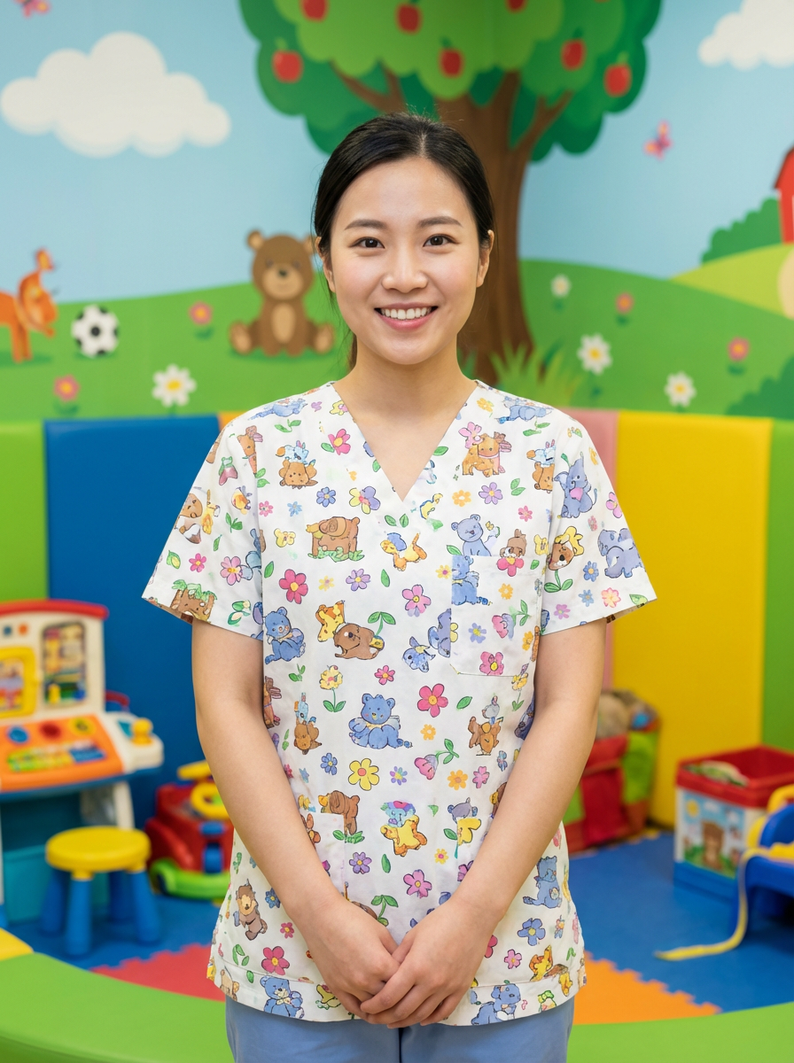 model as pediatric nurse, colorful friendly scrubs, warm inviting smile, cheerful expression
