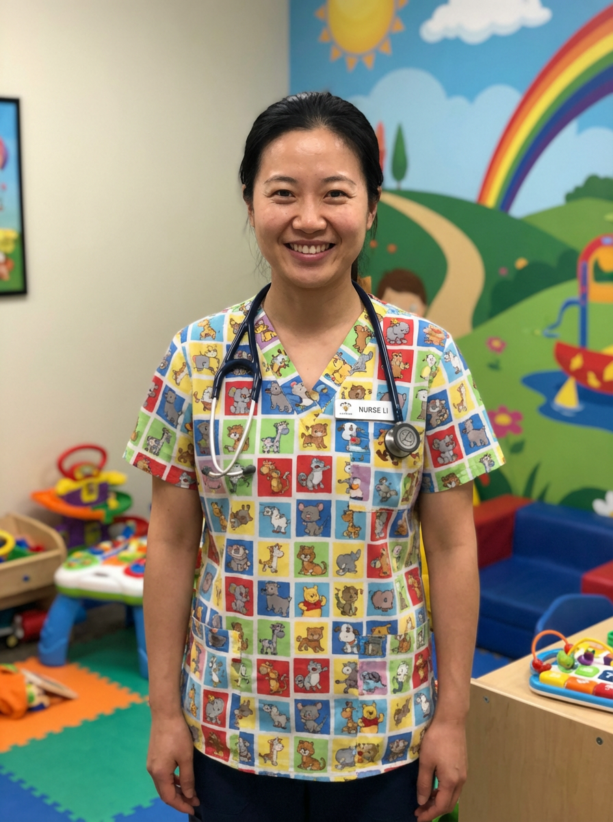 model as pediatric nurse, colorful friendly scrubs, warm inviting smile, cheerful expression