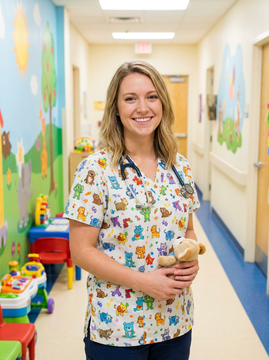 model as pediatric nurse, colorful friendly scrubs, warm inviting smile, cheerful expression