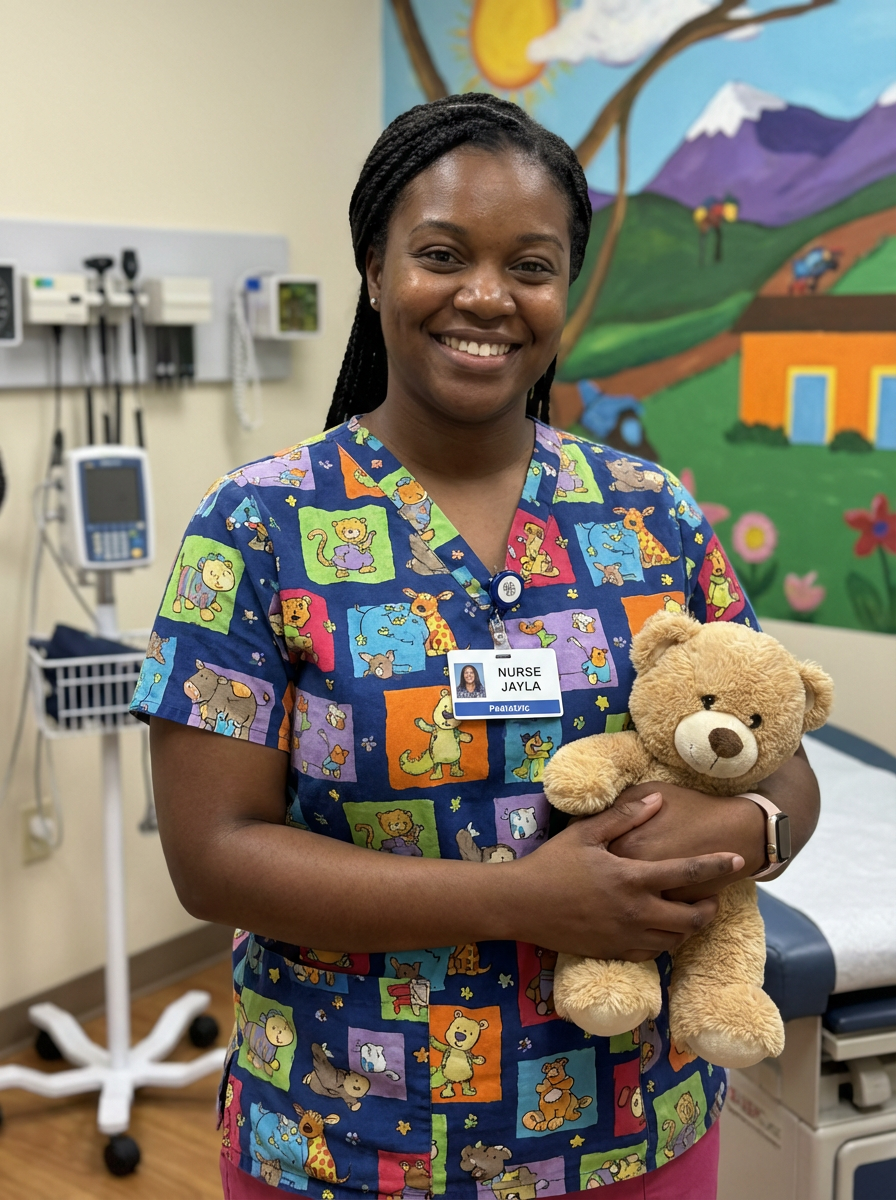 model as pediatric nurse, colorful friendly scrubs, warm inviting smile, cheerful expression