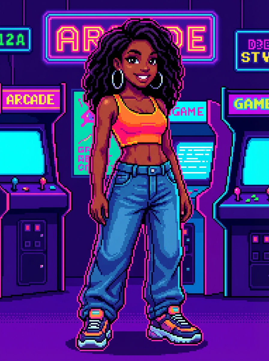model as pixel art character in 16-bit video game style, standing confidently in front of retro arcade, wearing pixelated crop top, baggy jeans, chunky sneakers, hoop earrings , vibrant neon colors, classic arcade aesthetic, pixel perfect details