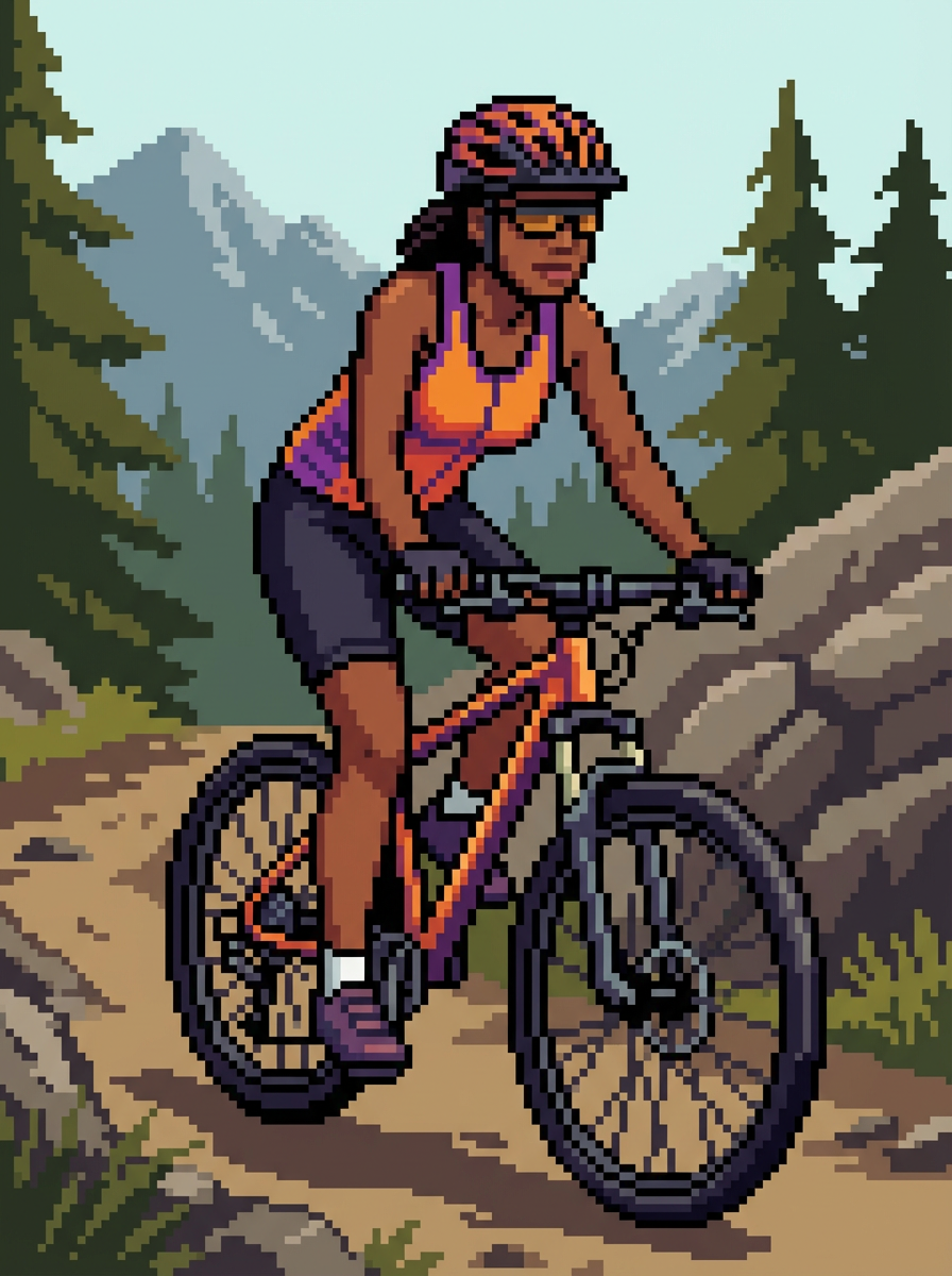 model as pixel art character in adventure pixel style, on pixelated mountain bike trail, wearing athletic pixel top, bike shorts, helmet , outdoor adventure pixel art, nature trail in pixel form