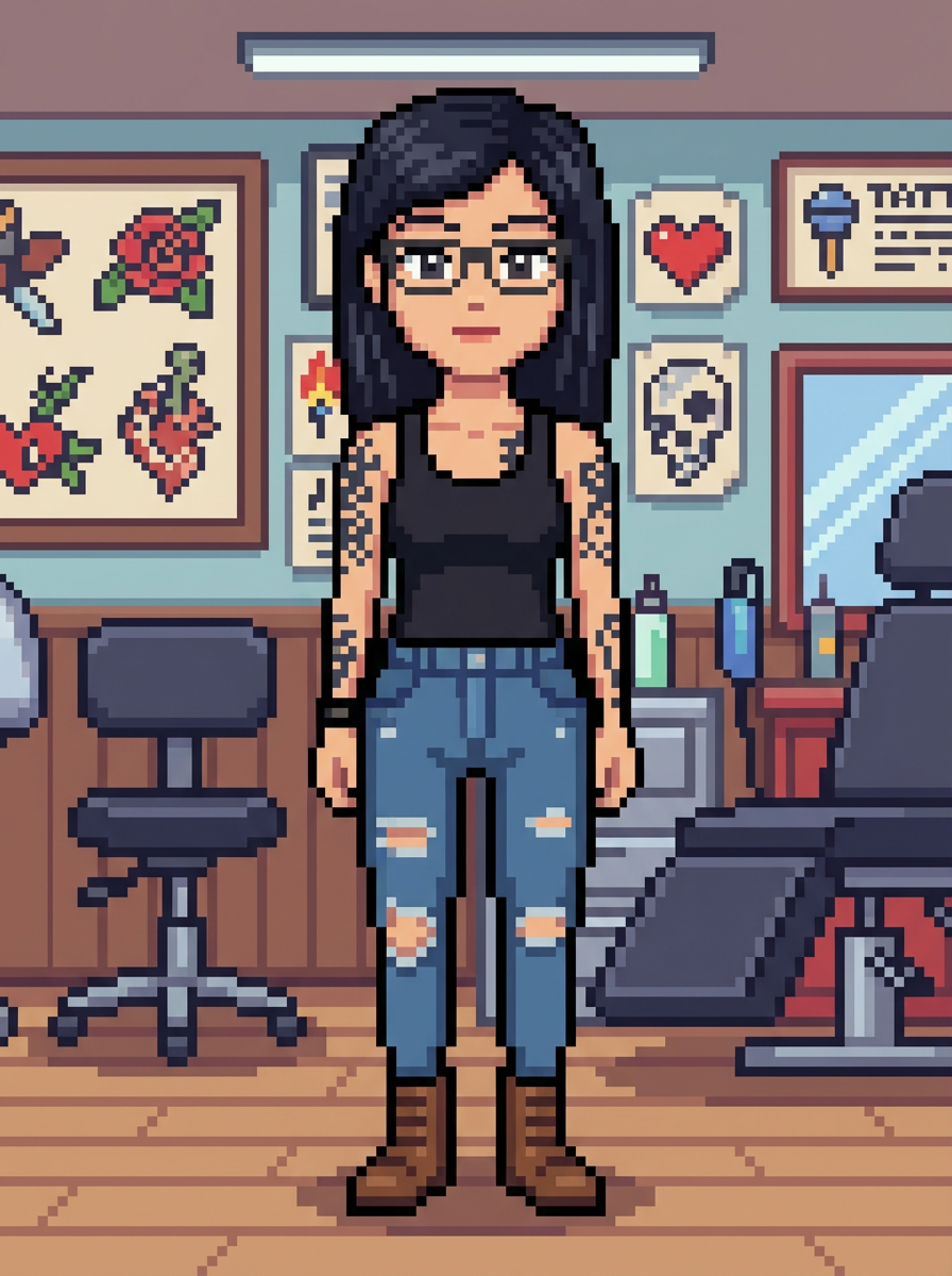 model as pixel art character in alternative pixel style, at pixelated tattoo parlor, wearing tank pixel top showing tattoos, ripped jeans, boots , tattoo shop pixel art, alternative culture pixel aesthetic