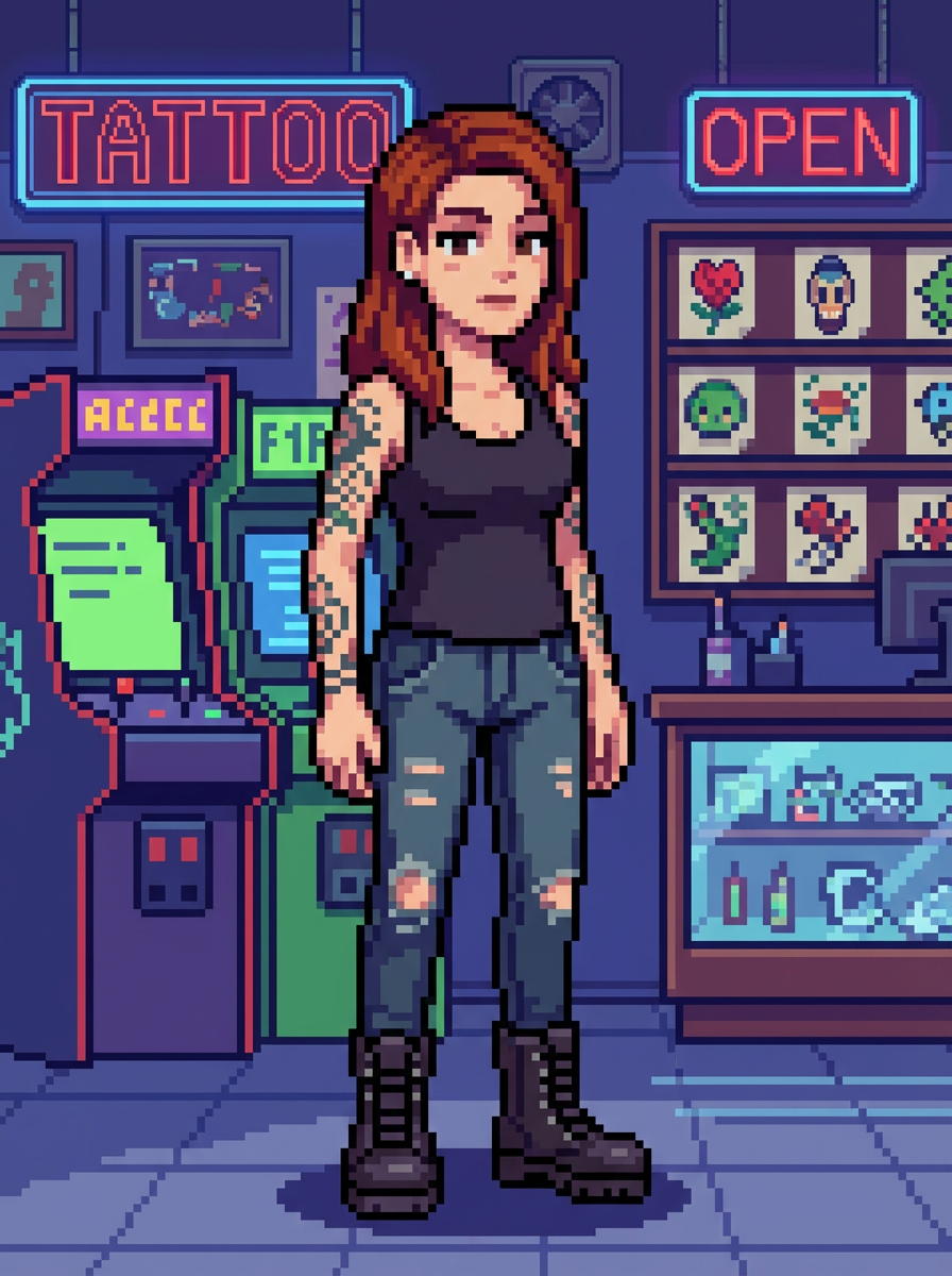 model as pixel art character in alternative pixel style, at pixelated tattoo parlor, wearing tank pixel top showing tattoos, ripped jeans, boots , tattoo shop pixel art, alternative culture pixel aesthetic