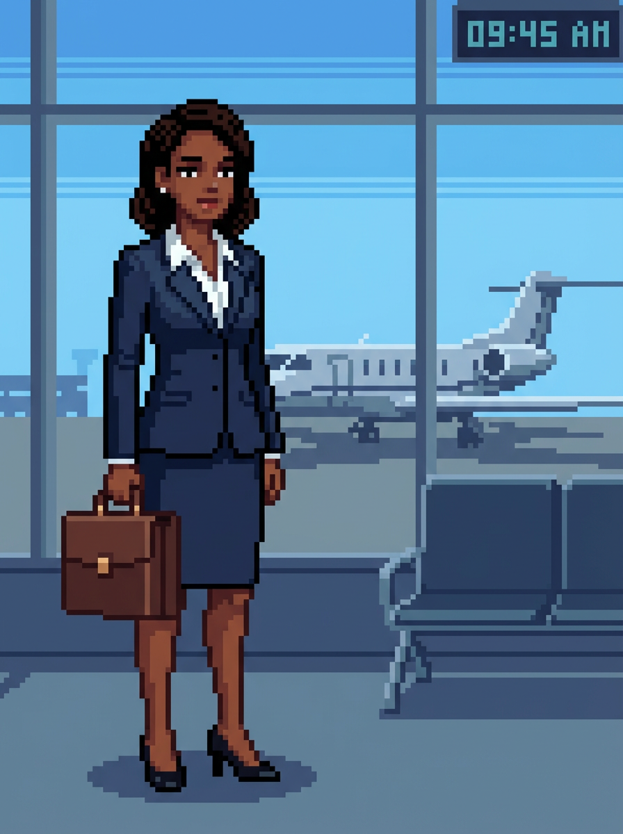 model as pixel art character in business pixel style, at pixelated airport with private jet, wearing business pixel suit, briefcase, heels , corporate pixel art aesthetic, professional pixel styling
