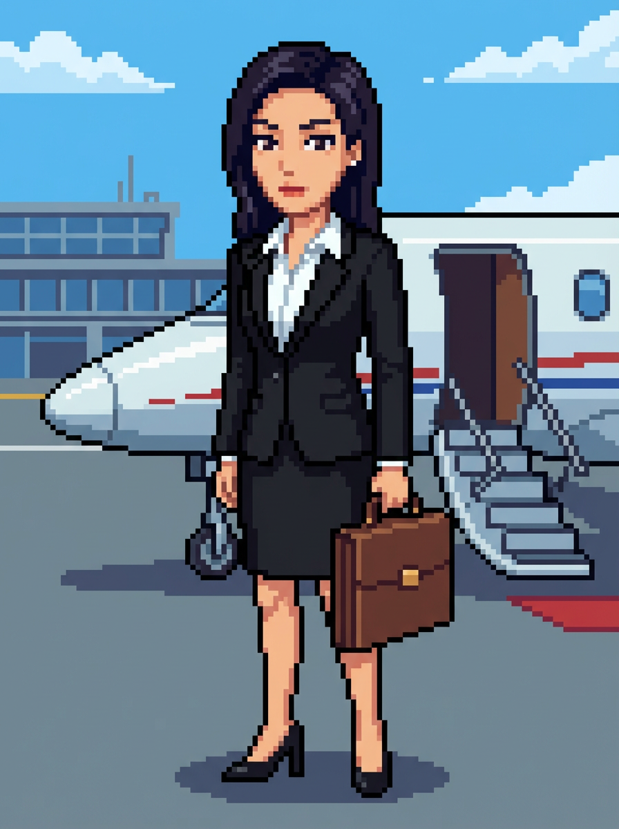 model as pixel art character in business pixel style, at pixelated airport with private jet, wearing business pixel suit, briefcase, heels , corporate pixel art aesthetic, professional pixel styling