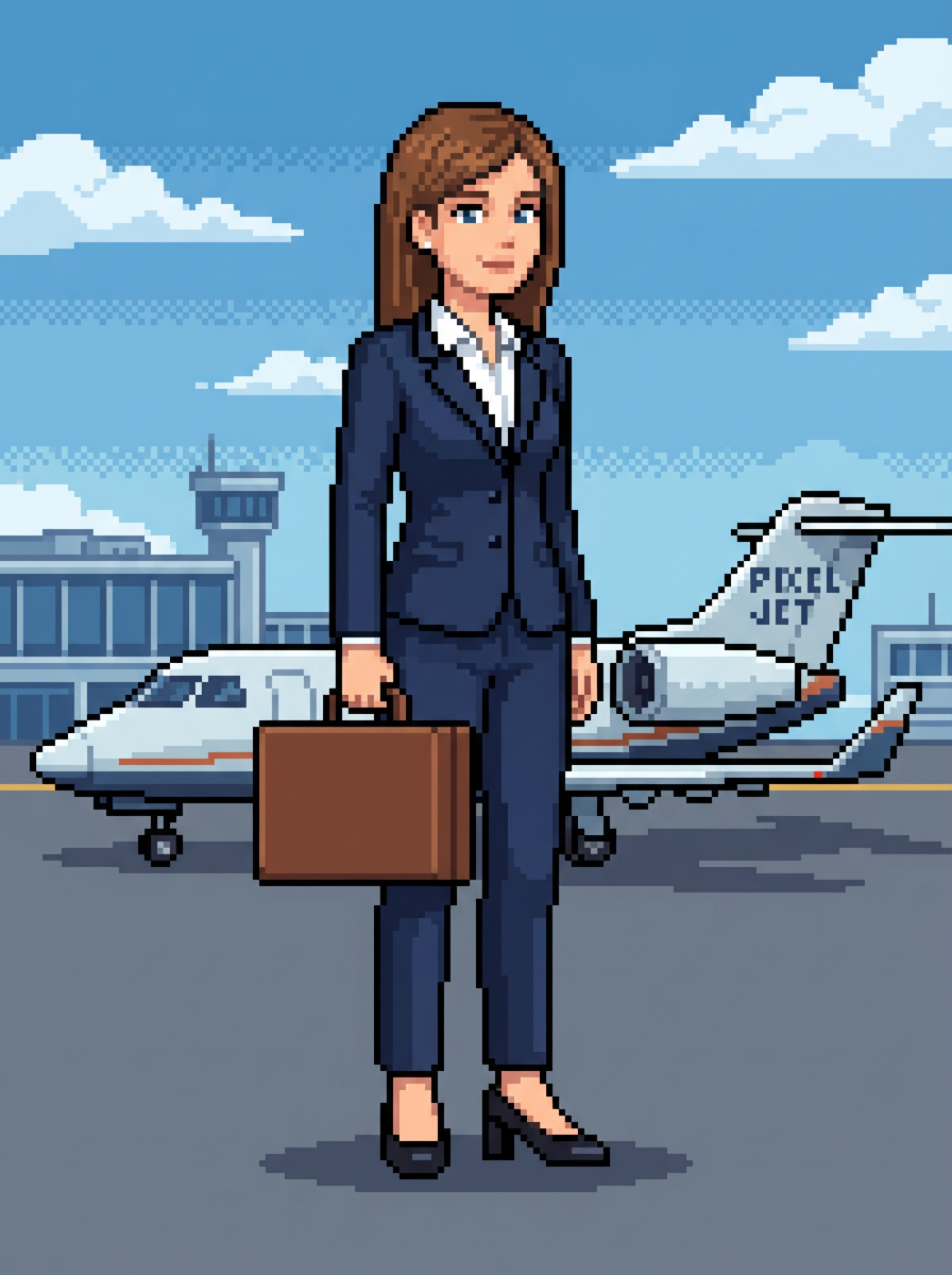 model as pixel art character in business pixel style, at pixelated airport with private jet, wearing business pixel suit, briefcase, heels , corporate pixel art aesthetic, professional pixel styling