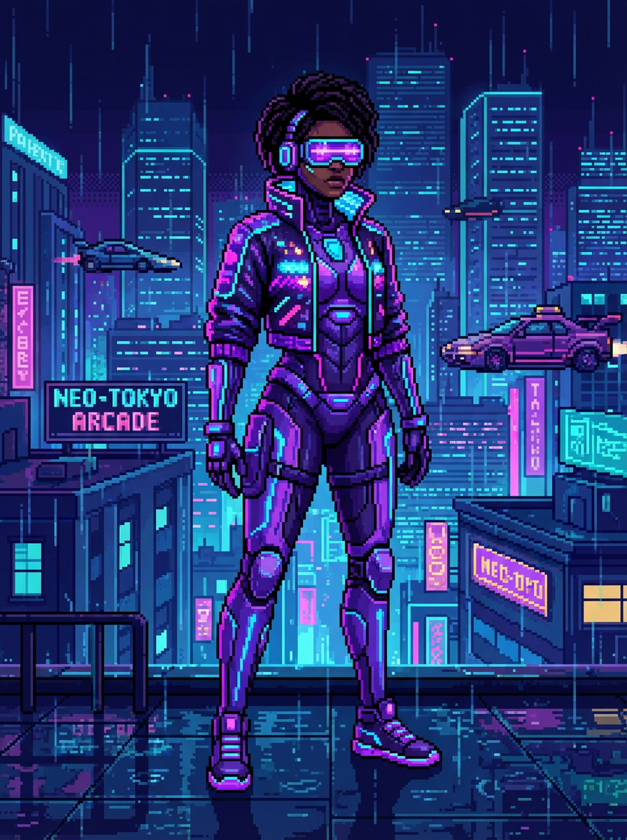model as pixel art character in cyberpunk pixel style, standing on pixelated rooftop overlooking neon city, wearing futuristic pixel outfit, neon accessories , glowing pixel effects, retro-futuristic aesthetic