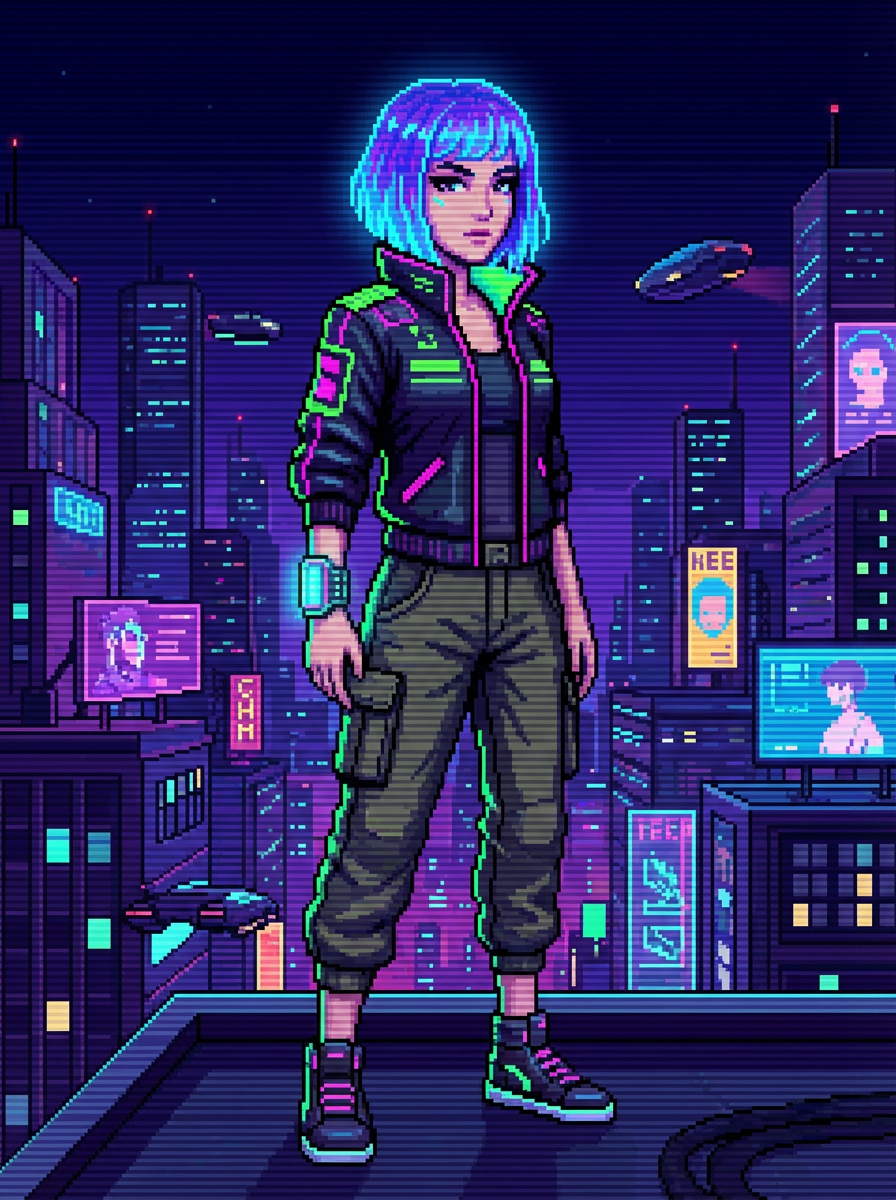 model as pixel art character in cyberpunk pixel style, standing on pixelated rooftop overlooking neon city, wearing futuristic pixel outfit, neon accessories , glowing pixel effects, retro-futuristic aesthetic
