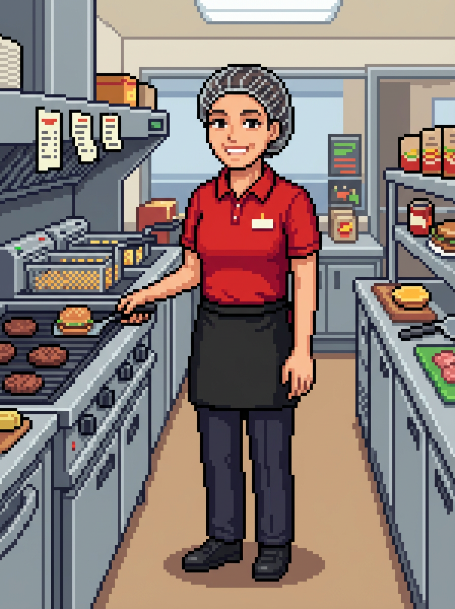 model as pixel art character in food service pixel style, in pixelated fast food kitchen, wearing uniform, hair net, pixel apron , restaurant kitchen pixel art, food service pixel aesthetic