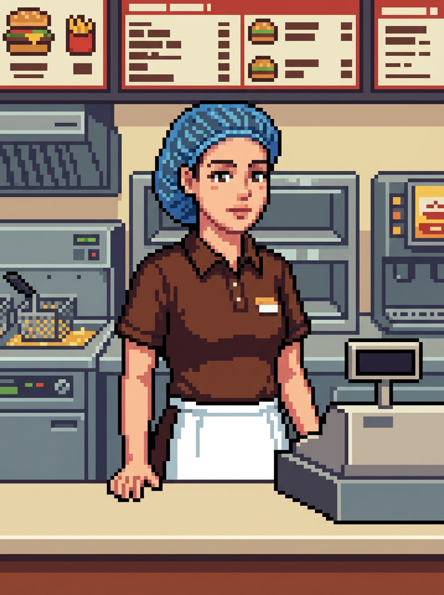 model as pixel art character in food service pixel style, in pixelated fast food kitchen, wearing uniform, hair net, pixel apron , restaurant kitchen pixel art, food service pixel aesthetic