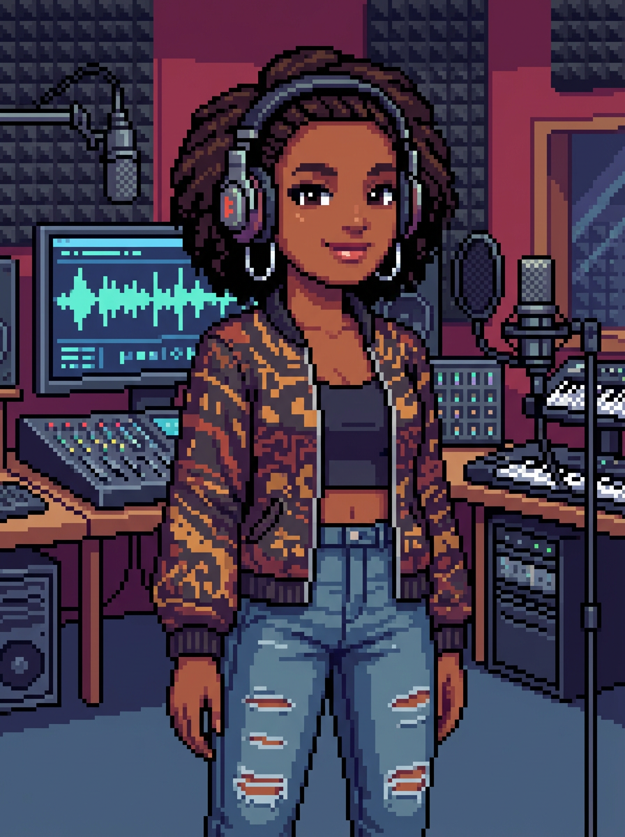 model as pixel art character in music pixel style, in pixelated recording studio, wearing trendy pixel outfit, headphones, jewelry , music studio pixel art, retro recording equipment in pixel form