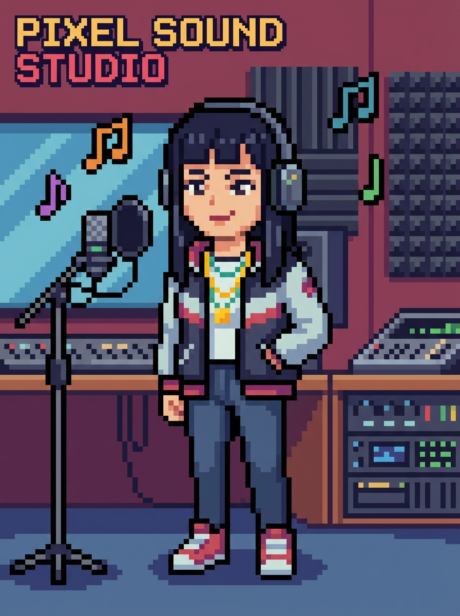 model as pixel art character in music pixel style, in pixelated recording studio, wearing trendy pixel outfit, headphones, jewelry , music studio pixel art, retro recording equipment in pixel form