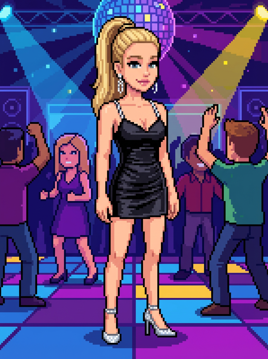 model as pixel art character in nightlife pixel style, at pixelated nightclub dance floor, wearing party pixel dress, heels, statement jewelry , disco pixel art lighting, retro club atmosphere