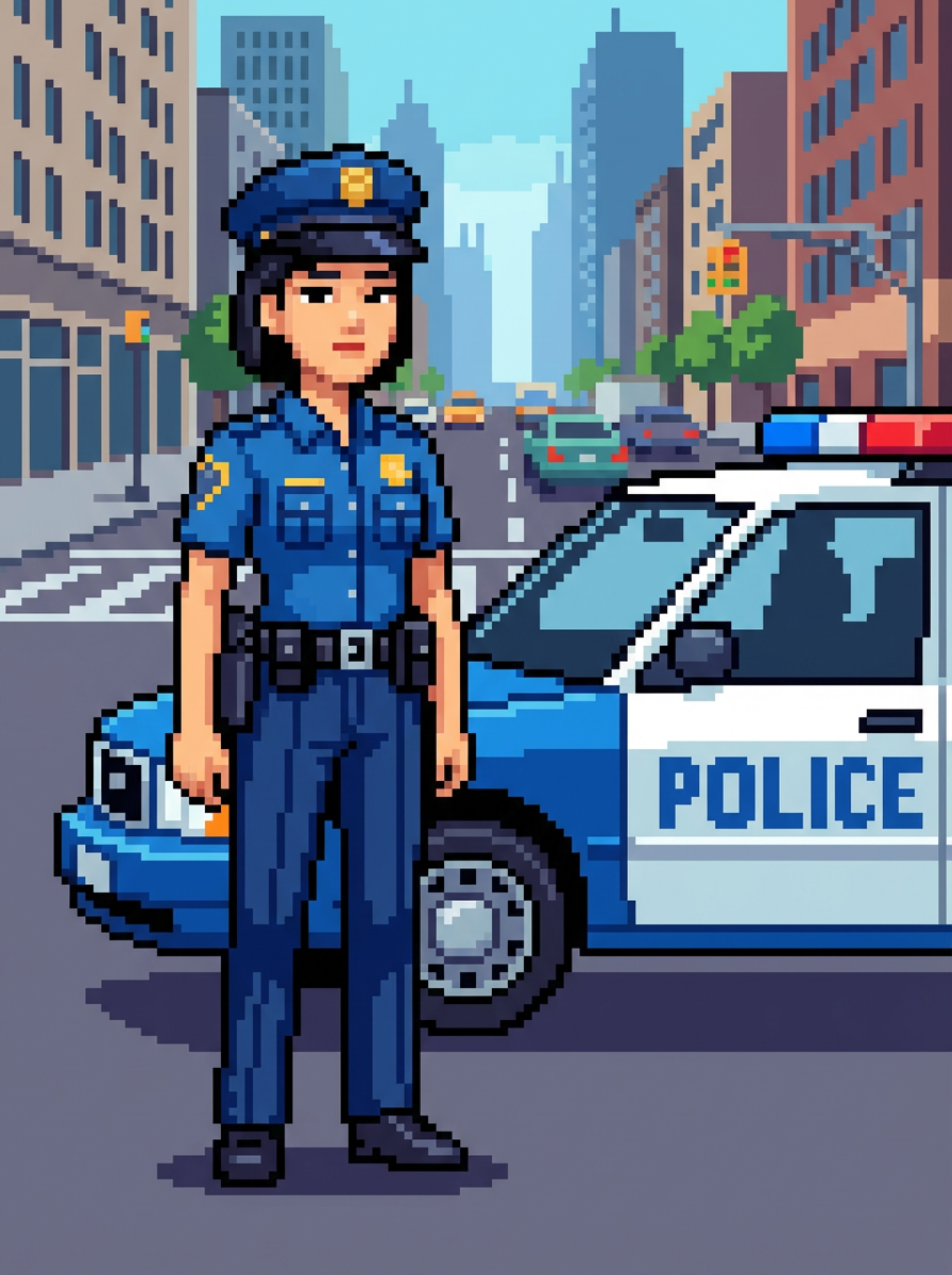 model as pixel art character in police pixel uniform, next to pixelated police car in downtown pixel city, wearing pixel police uniform, badge, utility belt, cap , classic beat cop pixel art style