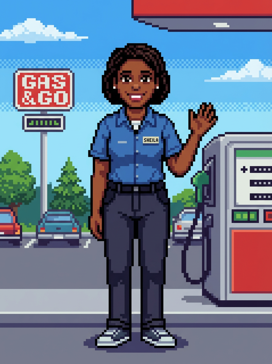 model as pixel art character in service pixel style, at pixelated gas station, wearing uniform pixel shirt, name tag, comfortable pants , roadside pixel art setting, classic americana pixel style