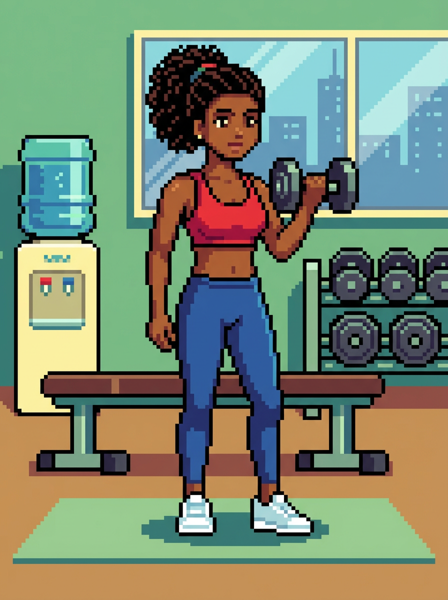 model as pixel art character in sports pixel style, in pixelated gym working out, wearing pixel sports bra, leggings, sneakers , retro fitness pixel art, classic gym equipment in pixel form