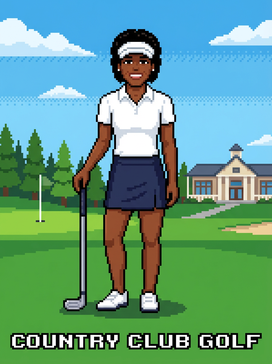 model as pixel art character in sports pixel style, on pixelated golf course, wearing polo pixel shirt, golf skirt, visor , country club pixel art, green golf course in pixel form