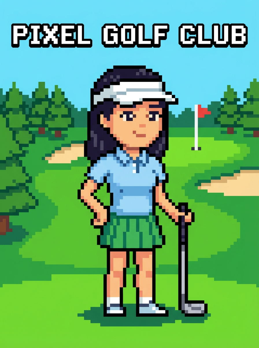 model as pixel art character in sports pixel style, on pixelated golf course, wearing polo pixel shirt, golf skirt, visor , country club pixel art, green golf course in pixel form