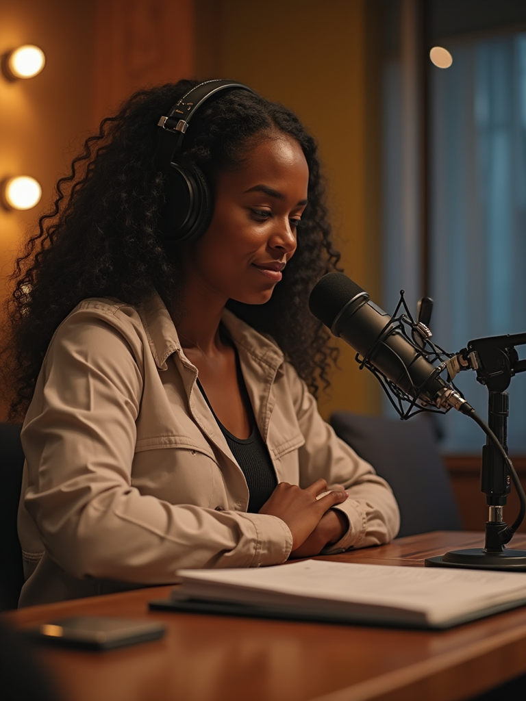 model as podcast co-host, wearing smart casual outfit , sharing microphone space, collaborative setup, warm studio atmosphere, friendly interaction