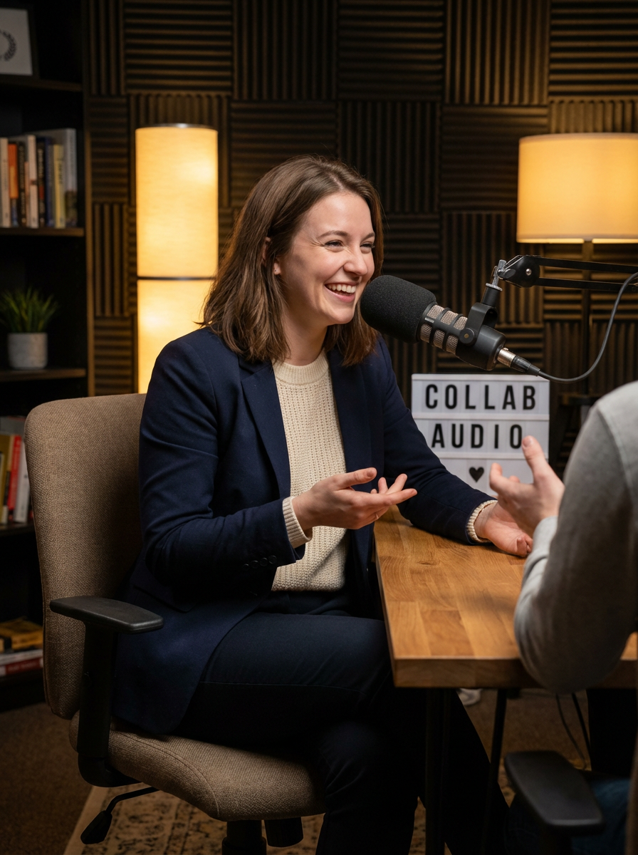 model as podcast co-host, wearing smart casual outfit , sharing microphone space, collaborative setup, warm studio atmosphere, friendly interaction