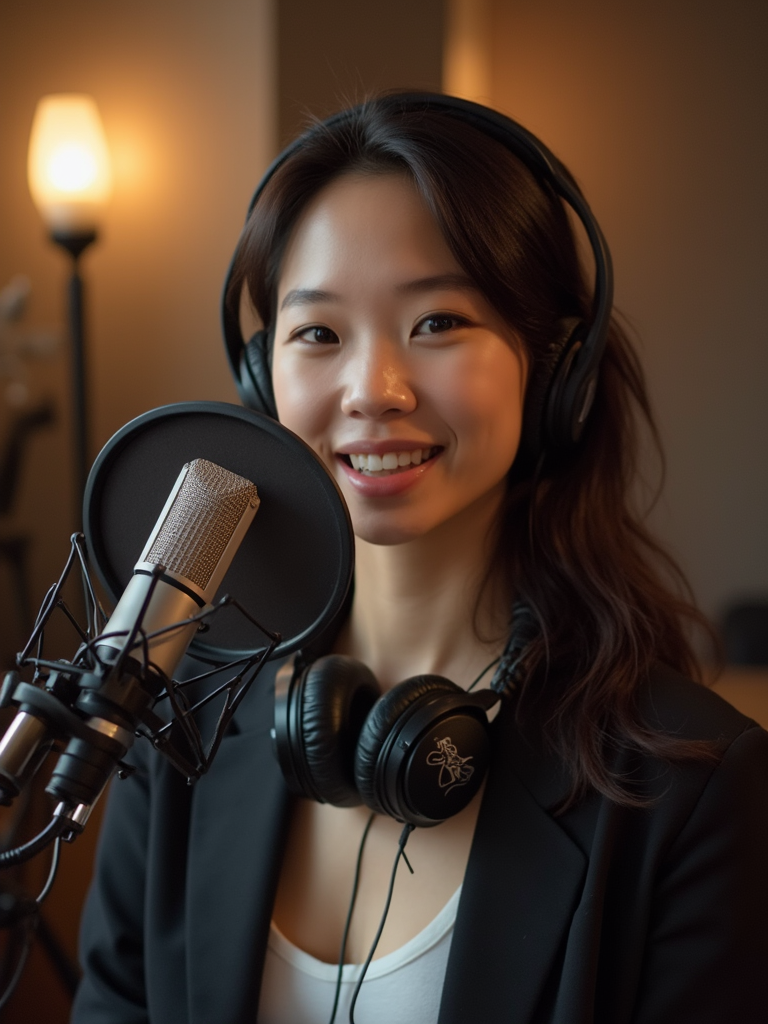 model as podcast host in professional studio, wearing stylish blazer over casual top , speaking into boom microphone, headphones around neck, warm studio lighting, confident expression