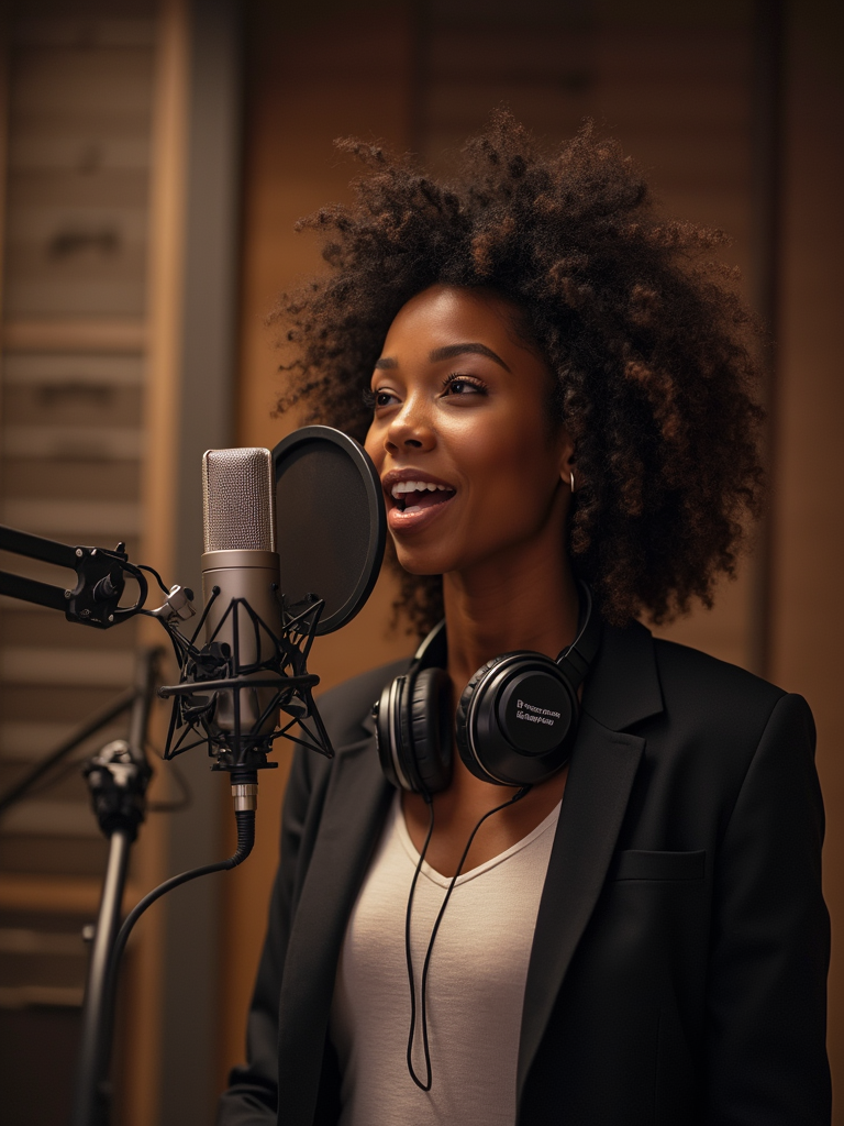 model as podcast host in professional studio, wearing stylish blazer over casual top , speaking into boom microphone, headphones around neck, warm studio lighting, confident expression