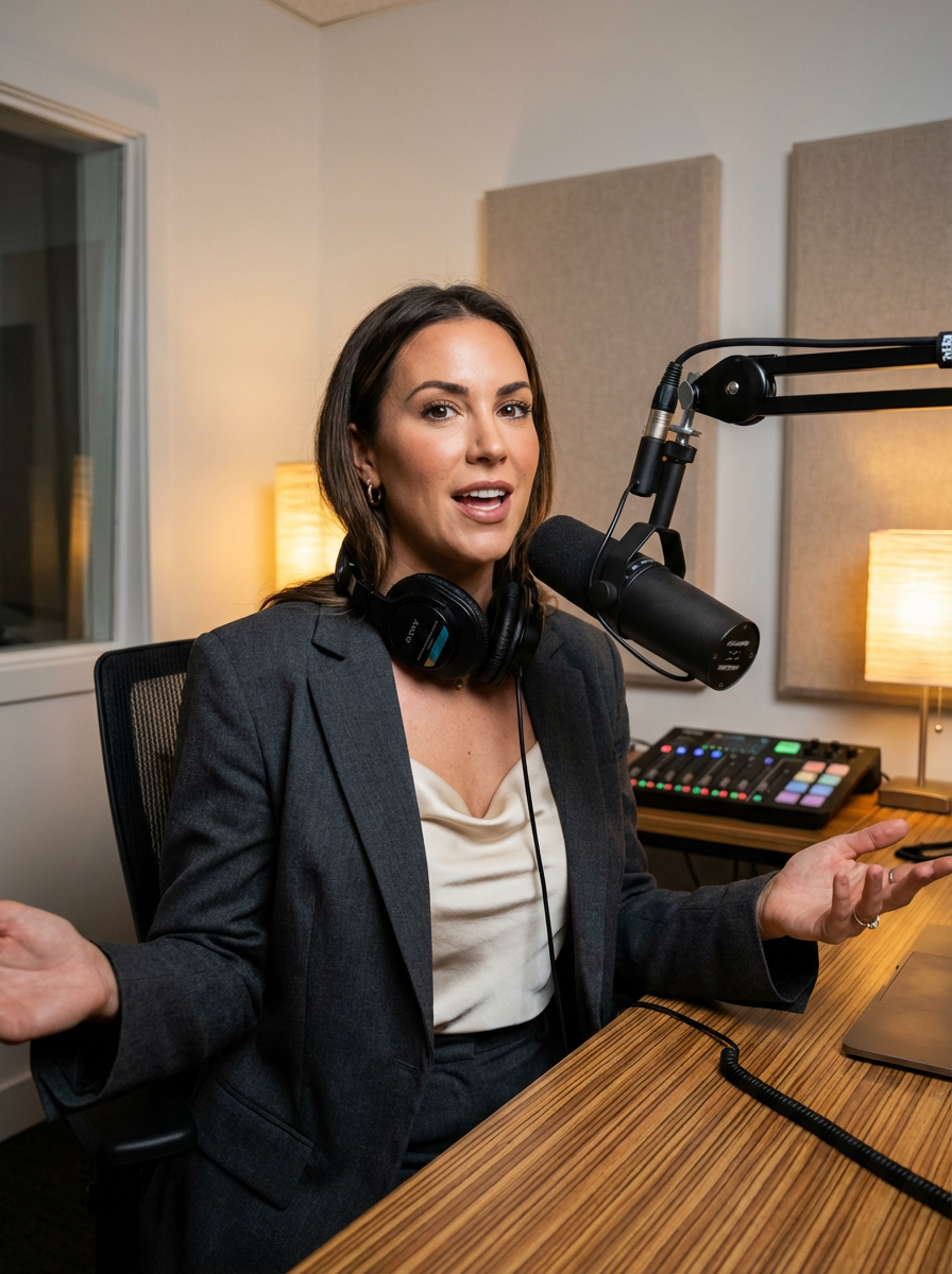 model as podcast host in professional studio, wearing stylish blazer over casual top , speaking into boom microphone, headphones around neck, warm studio lighting, confident expression