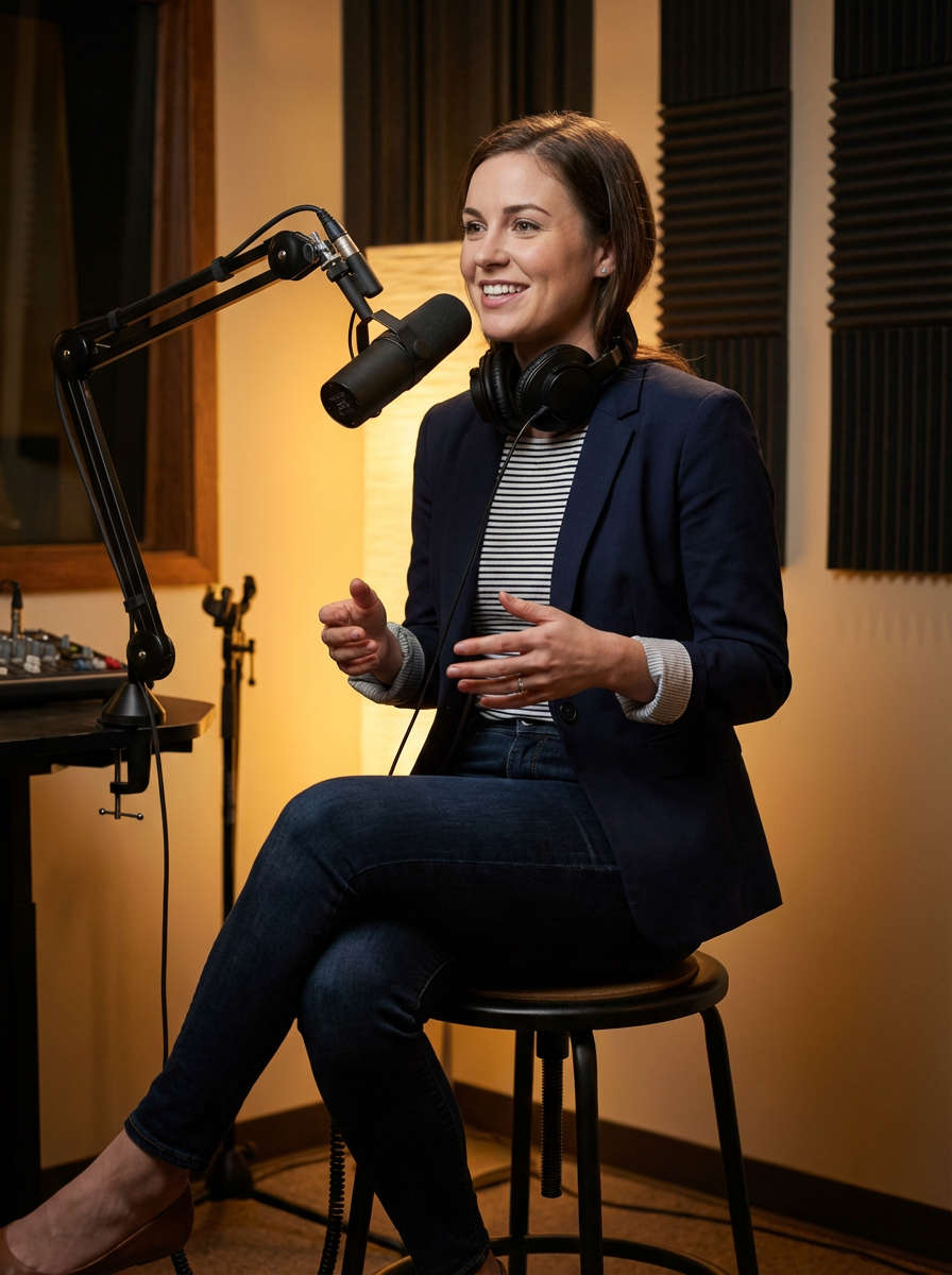 model as podcast host in professional studio, wearing stylish blazer over casual top , speaking into boom microphone, headphones around neck, warm studio lighting, confident expression