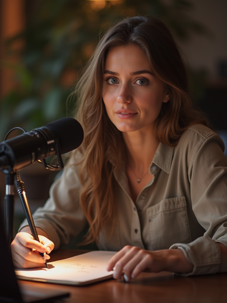 model as podcast interviewer, wearing professional blouse , leaning toward microphone, notepad visible, intimate conversation setup, warm lighting