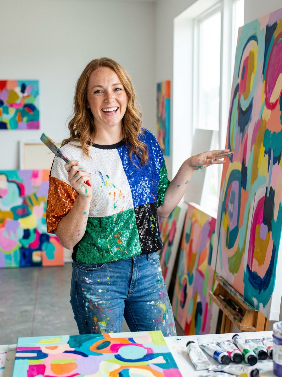 model as pop artist, colorful vibrant style, energetic expression, modern studio setting